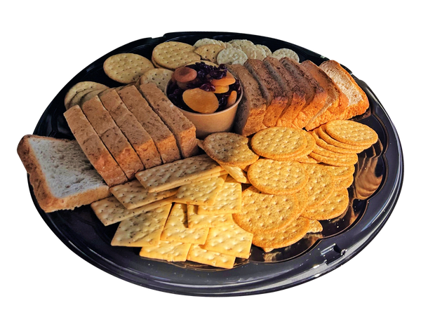 assortment of breads, crackers, meats, pickles, mixed nuts, olives, grapes and cheese